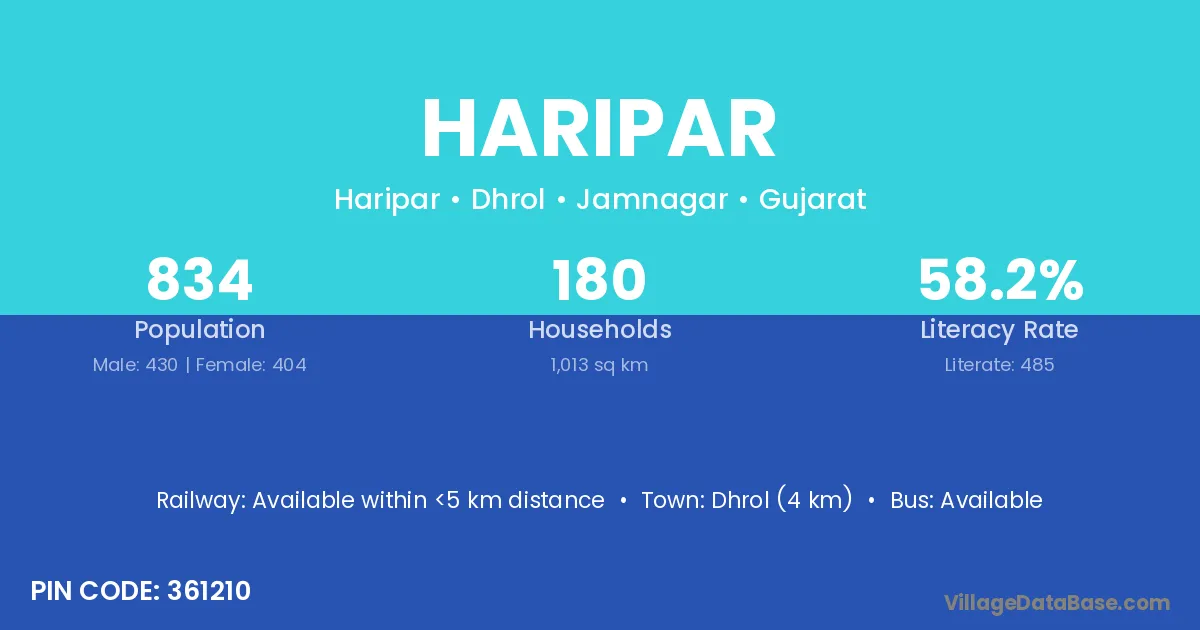 Khambhalia (5 km) is the nearest town to Haripar village for major economic activities and is located approximately 5 km away.