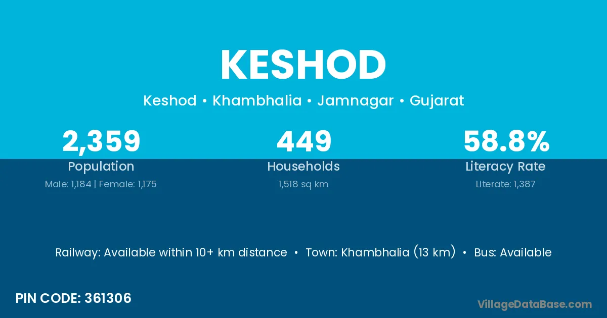 Khambhalia (13 km) is the nearest town to Keshod village for major economic activities and is located approximately 13 km away.