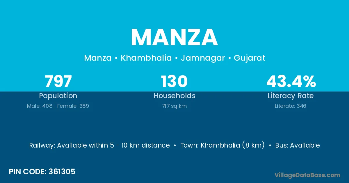 Khambhalia (8 km) is the nearest town to Manza village for major economic activities and is located approximately 8 km away.