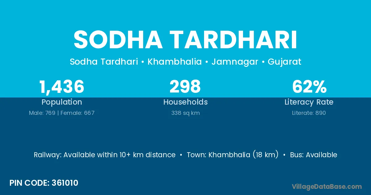 Khambhalia (18 km) is the nearest town to Sodha Tardhari village for major economic activities and is located approximately 18 km away.