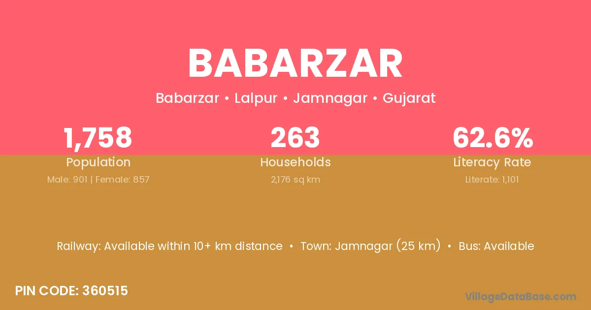 Jamnagar (25 km) is the nearest town to Babarzar village for major economic activities and is located approximately 25 km away.