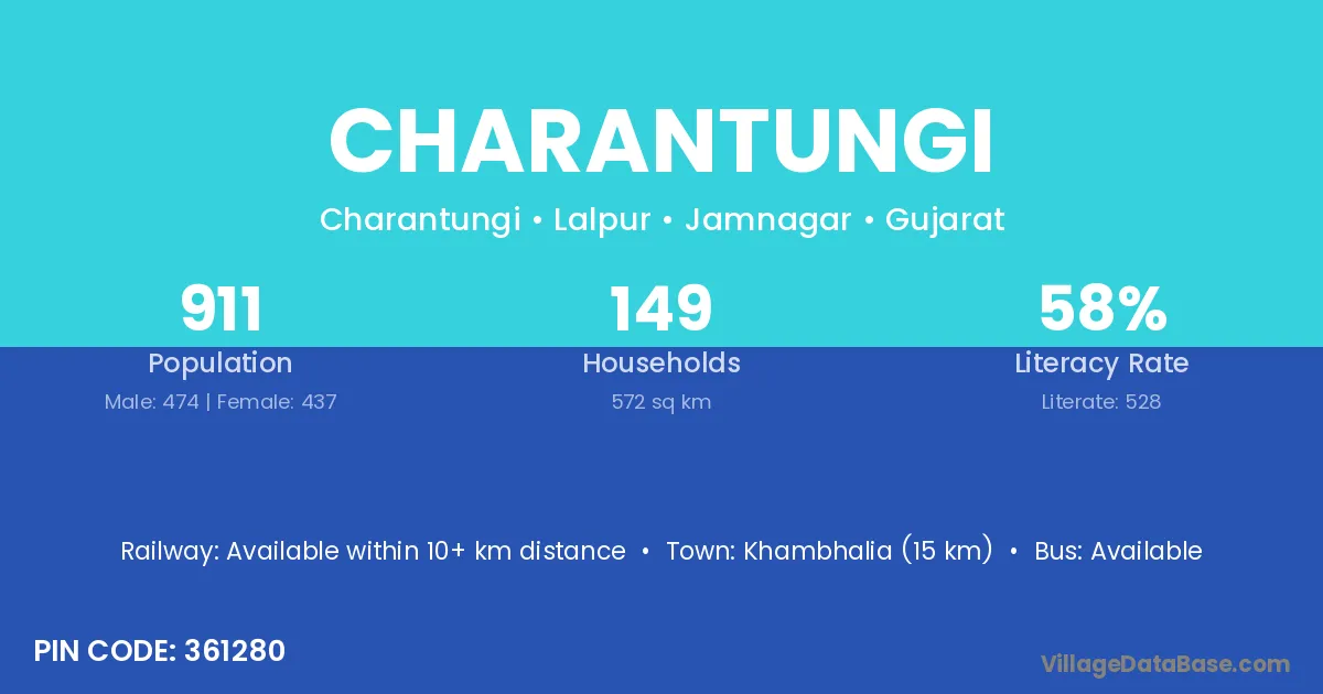 Khambhalia (15 km) is the nearest town to Charantungi village for major economic activities and is located approximately 15 km away.