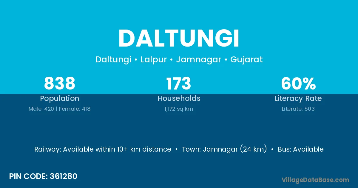 Jamnagar (24 km) is the nearest town to Daltungi village for major economic activities and is located approximately 24 km away.