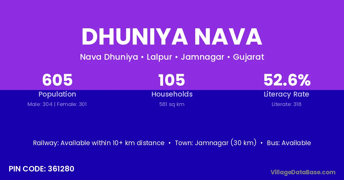 Jamnagar (30 km) is the nearest town to Dhuniya Nava village for major economic activities and is located approximately 30 km away.