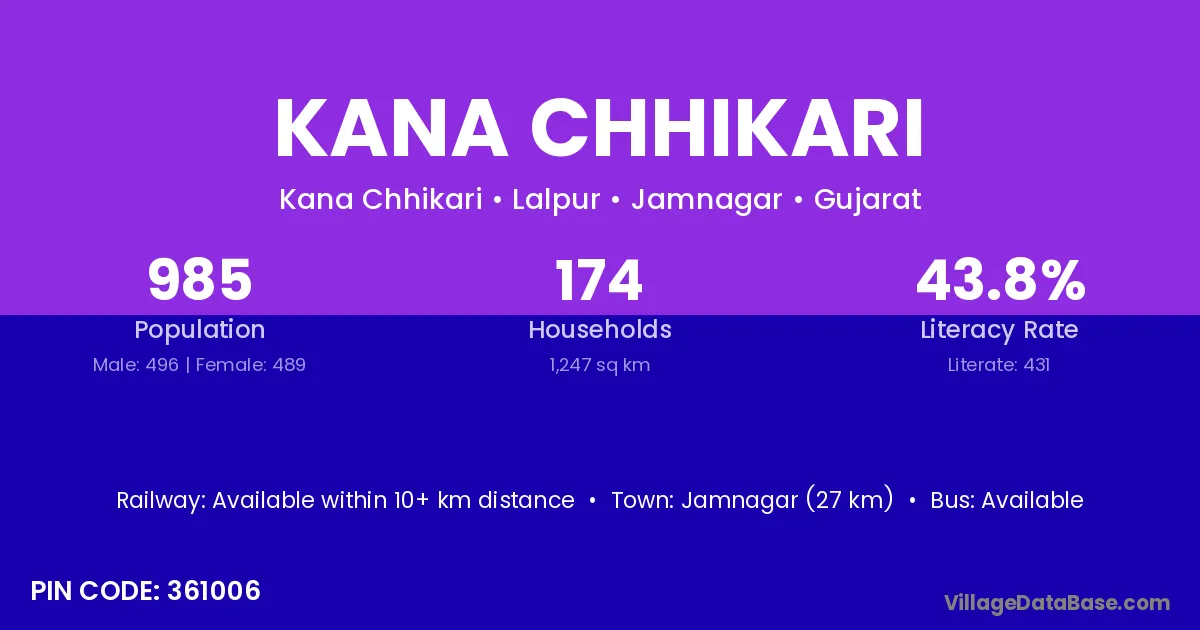 Jamnagar (27 km) is the nearest town to Kana Chhikari village for major economic activities and is located approximately 27 km away.