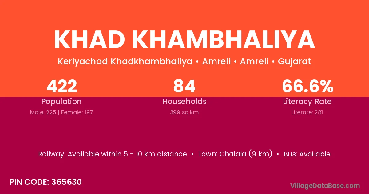 The literacy rate of Khad Khambhaliya village is 54.46%. Male literacy stands at 64.46% and female literacy at 43.92%.