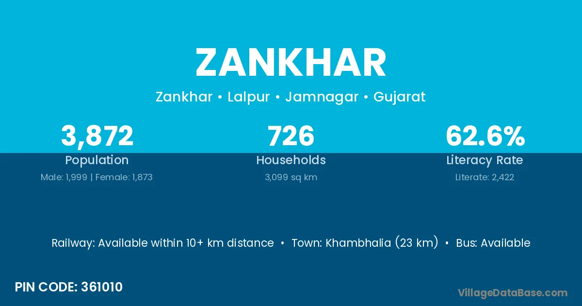 Khambhalia (23 km) is the nearest town to Zankhar village for major economic activities and is located approximately 23 km away.