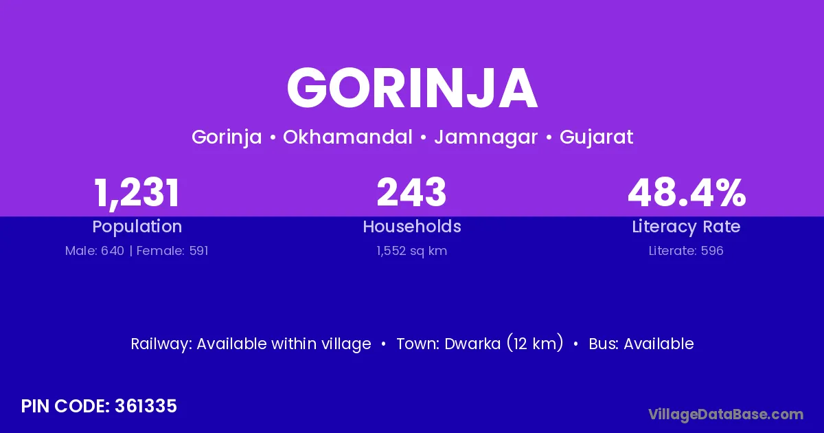 Dwarka (12 km) is the nearest town to Gorinja village for major economic activities and is located approximately 12 km away.