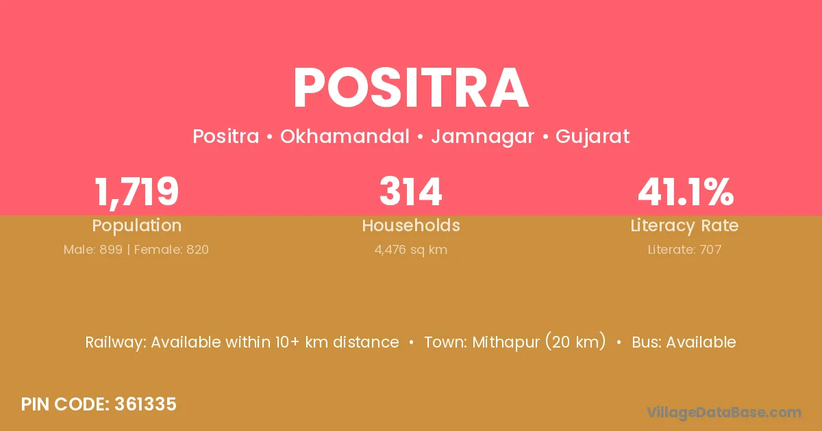 Mithapur (20 km) is the nearest town to Positra village for major economic activities and is located approximately 20 km away.