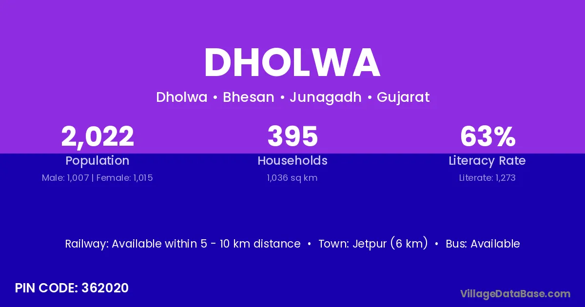 Jetpur (6 km) is the nearest town to Dholwa village for major economic activities and is located approximately 6 km away.