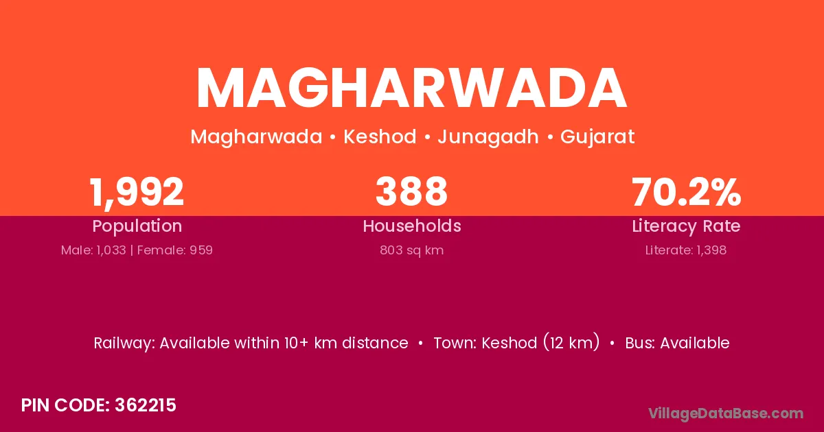 Keshod (12 km) is the nearest town to Magharwada village for major economic activities and is located approximately 12 km away.