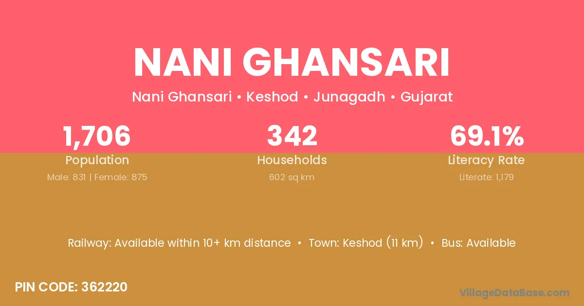 Keshod (11 km) is the nearest town to Nani Ghansari village for major economic activities and is located approximately 11 km away.