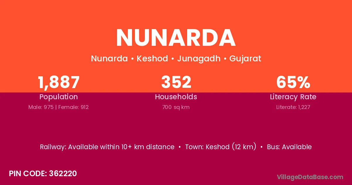 Keshod (12 km) is the nearest town to Nunarda village for major economic activities and is located approximately 12 km away.
