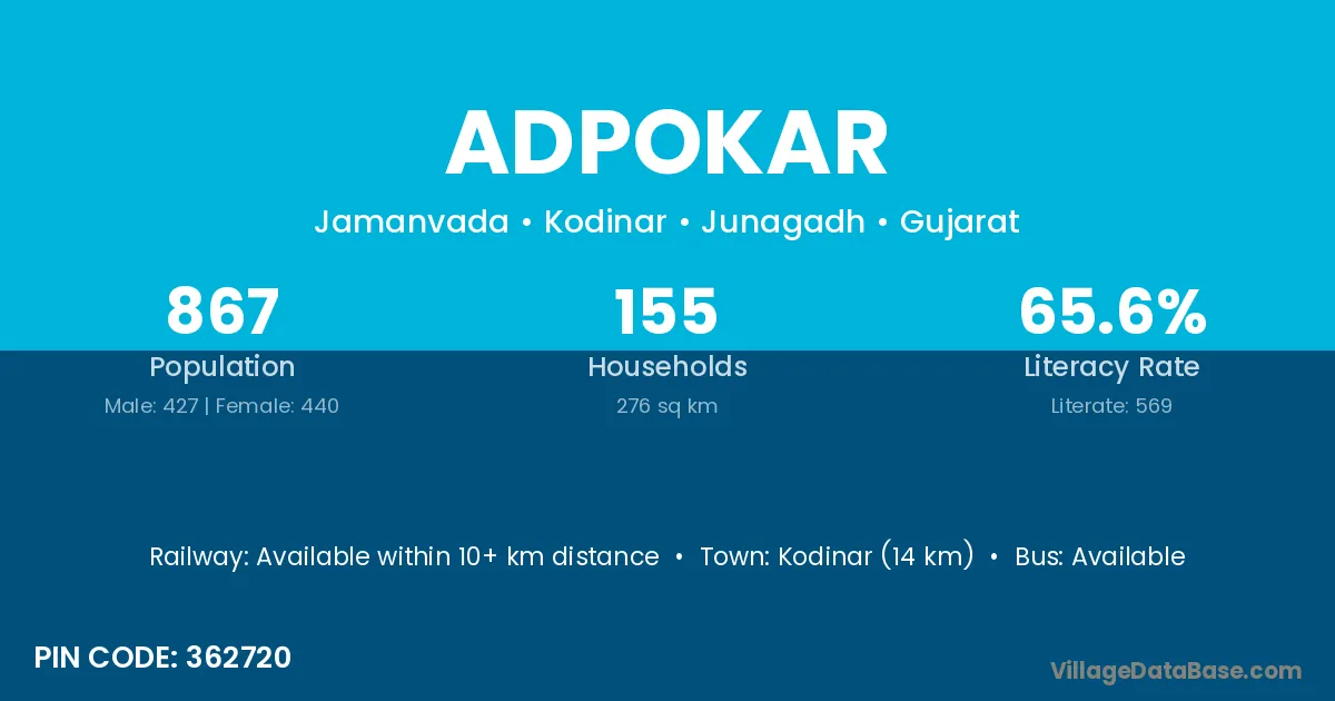 Kodinar (14 km) is the nearest town to Adpokar village for major economic activities and is located approximately 14 km away.