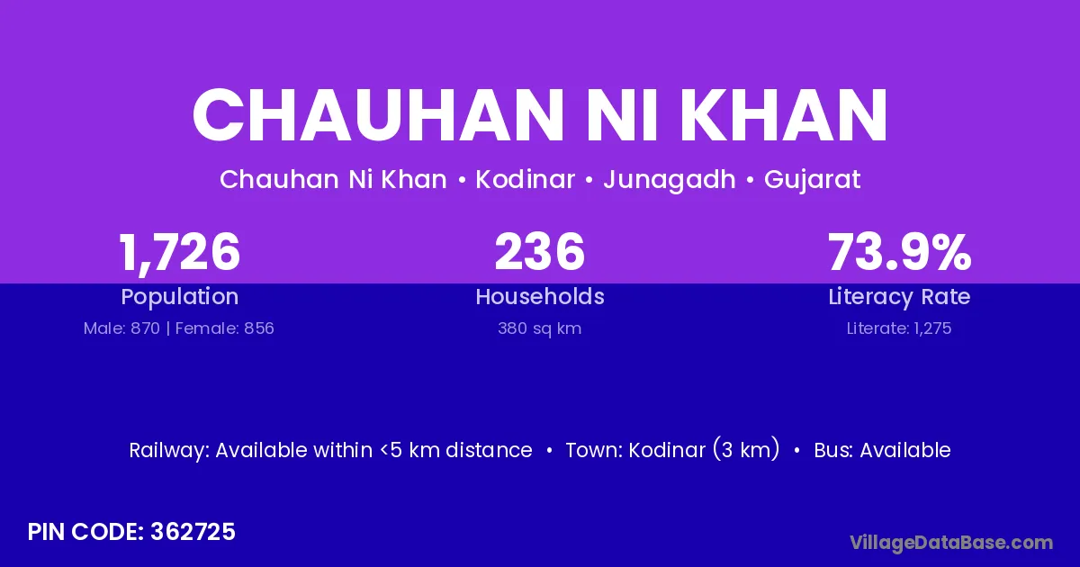 Kodinar (3 km) is the nearest town to Chauhan Ni Khan village for major economic activities and is located approximately 3 km away.