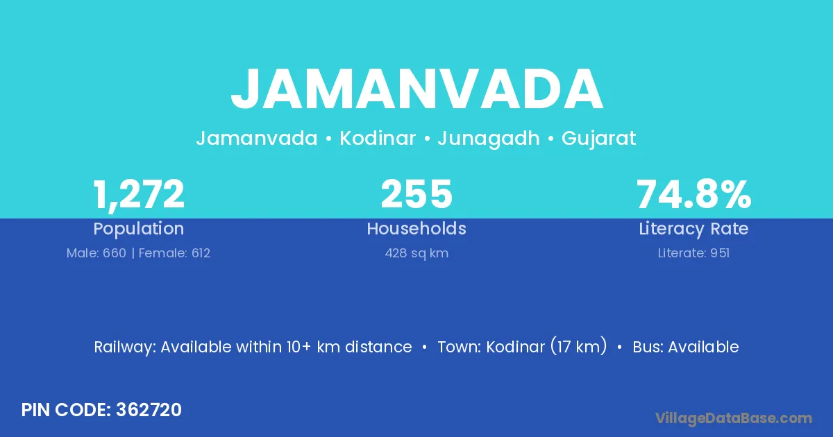 Kodinar (17 km) is the nearest town to Jamanvada village for major economic activities and is located approximately 17 km away.