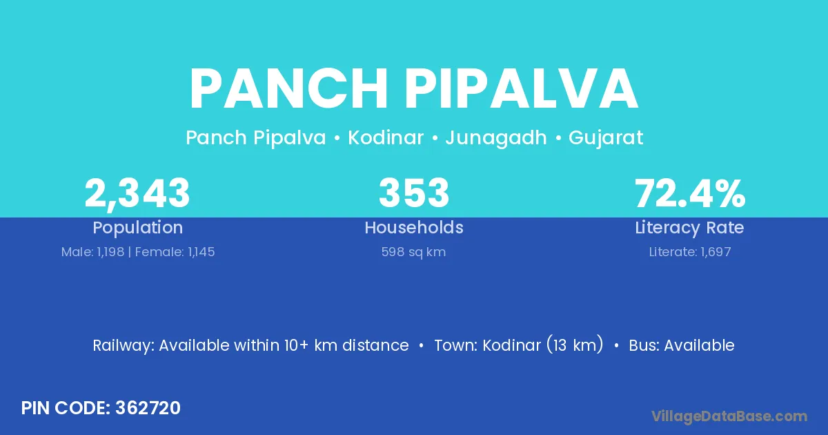Kodinar (13 km) is the nearest town to Panch Pipalva village for major economic activities and is located approximately 13 km away.