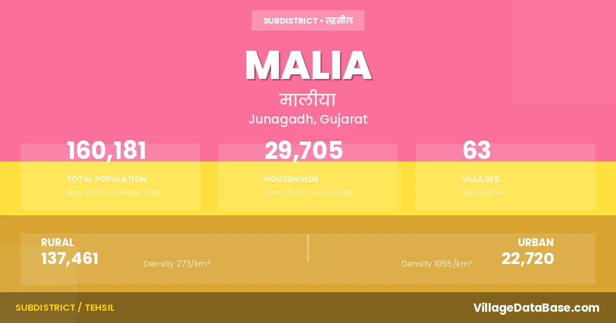 According to the 2011 census The total area of Malia Taluka is 525 km², with a population of 160181 people. The population density is 305 inhabitants per square kilometre, and there are approximately 29705 houses in the sub district.