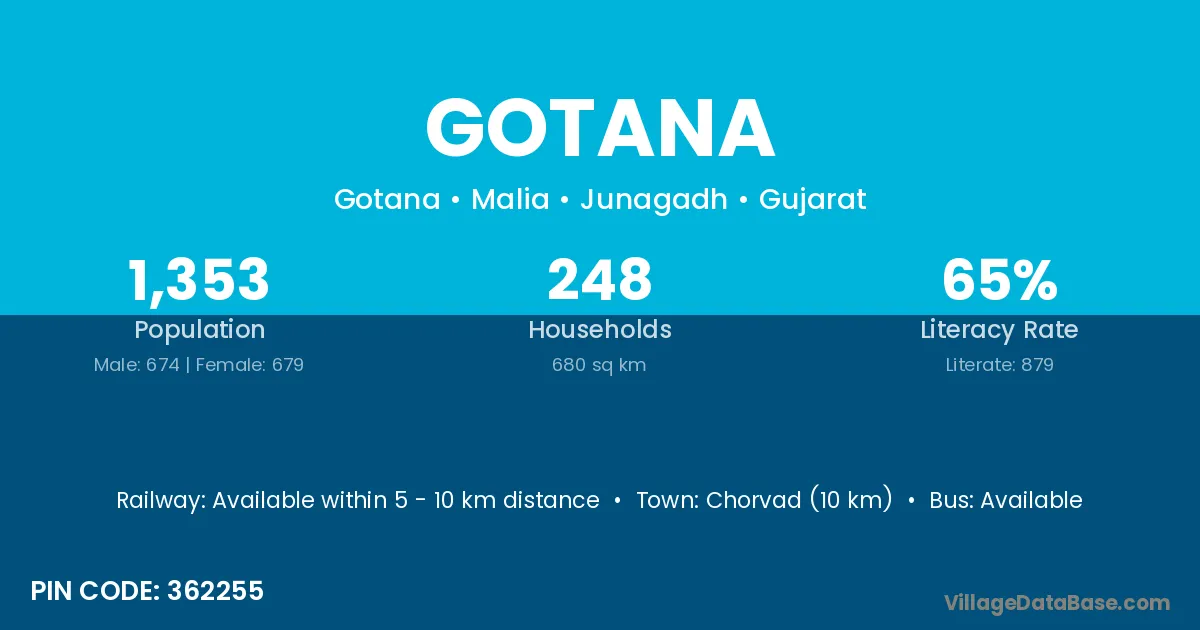 Chorvad (10 km) is the nearest town to Gotana village for major economic activities and is located approximately 10 km away.