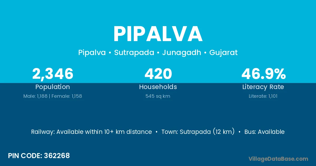 Chorvad (15 km) is the nearest town to Pipalva village for major economic activities and is located approximately 15 km away.