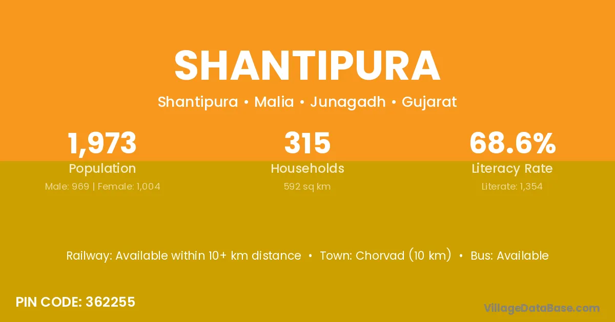 Chorvad (10 km) is the nearest town to Shantipura village for major economic activities and is located approximately 10 km away.