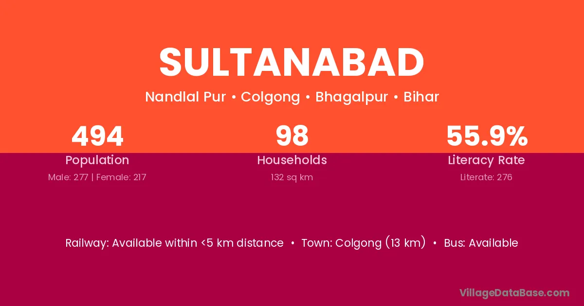 The literacy rate of Sultanabad village is 73.84%. Male literacy stands at 82.49% and female literacy at 64.72%.