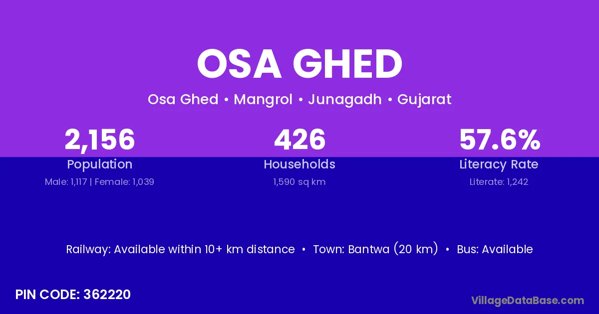 Osa Ghed village has a total population of 2,156 people, of which 1,117 are males and 1,039 are females.