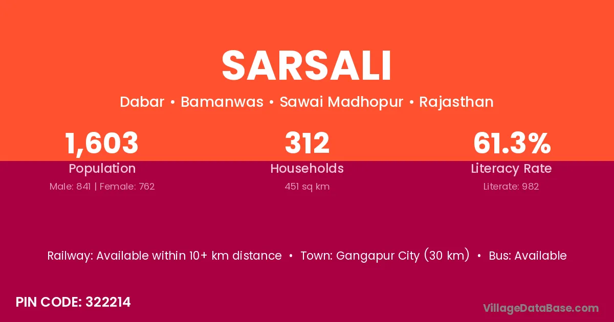 Sarsali village has a total population of 1,881 people, of which 970 are males and 911 are females.