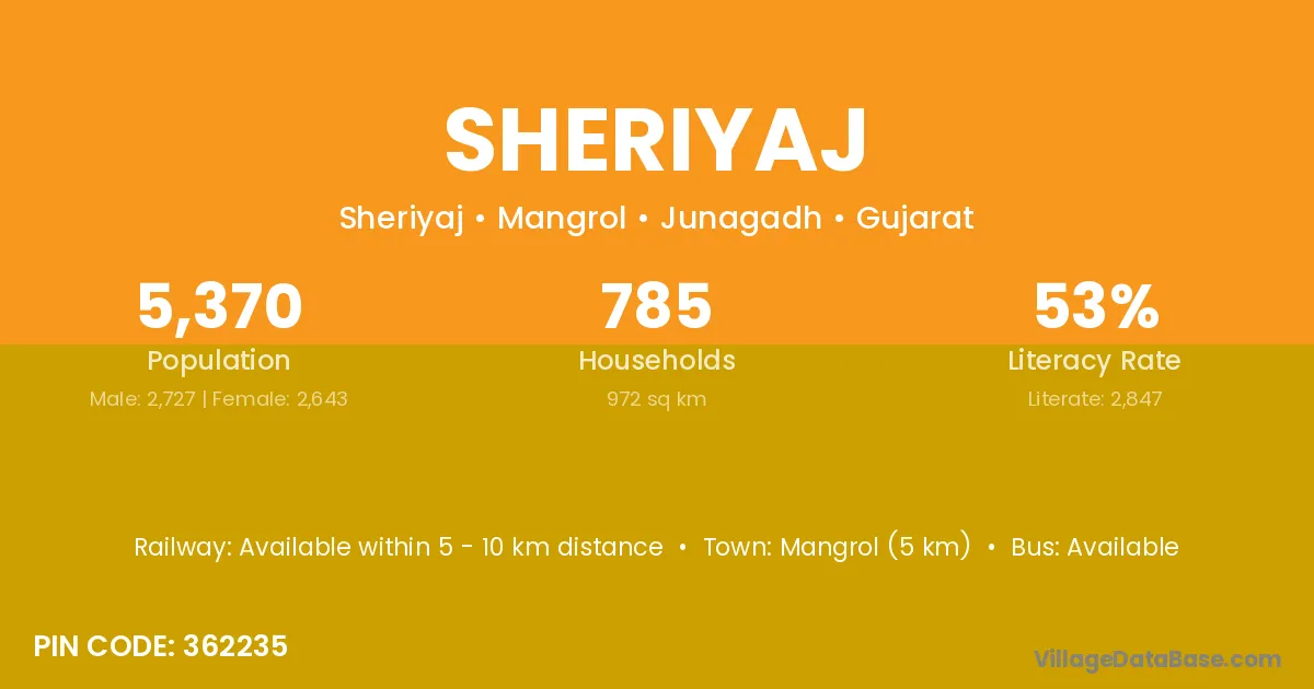 Mangrol (5 km) is the nearest town to Sheriyaj village for major economic activities and is located approximately 5 km away.