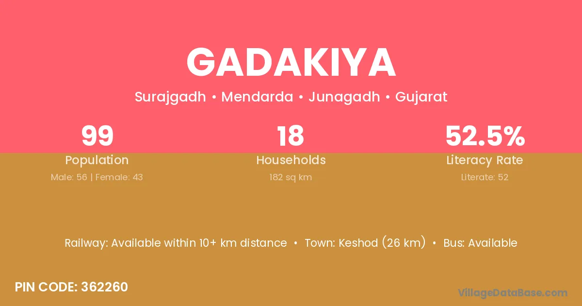 Keshod (26 km) is the nearest town to Gadakiya village for major economic activities and is located approximately 26 km away.