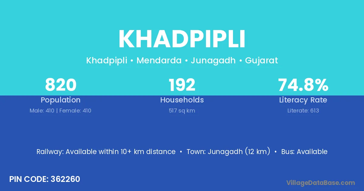 Junagadh (12 km) is the nearest town to Khadpipli village for major economic activities and is located approximately 12 km away.