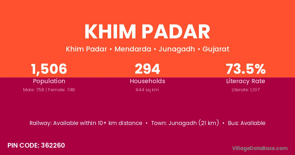 Junagadh (21 km) is the nearest town to Khim Padar village for major economic activities and is located approximately 21 km away.