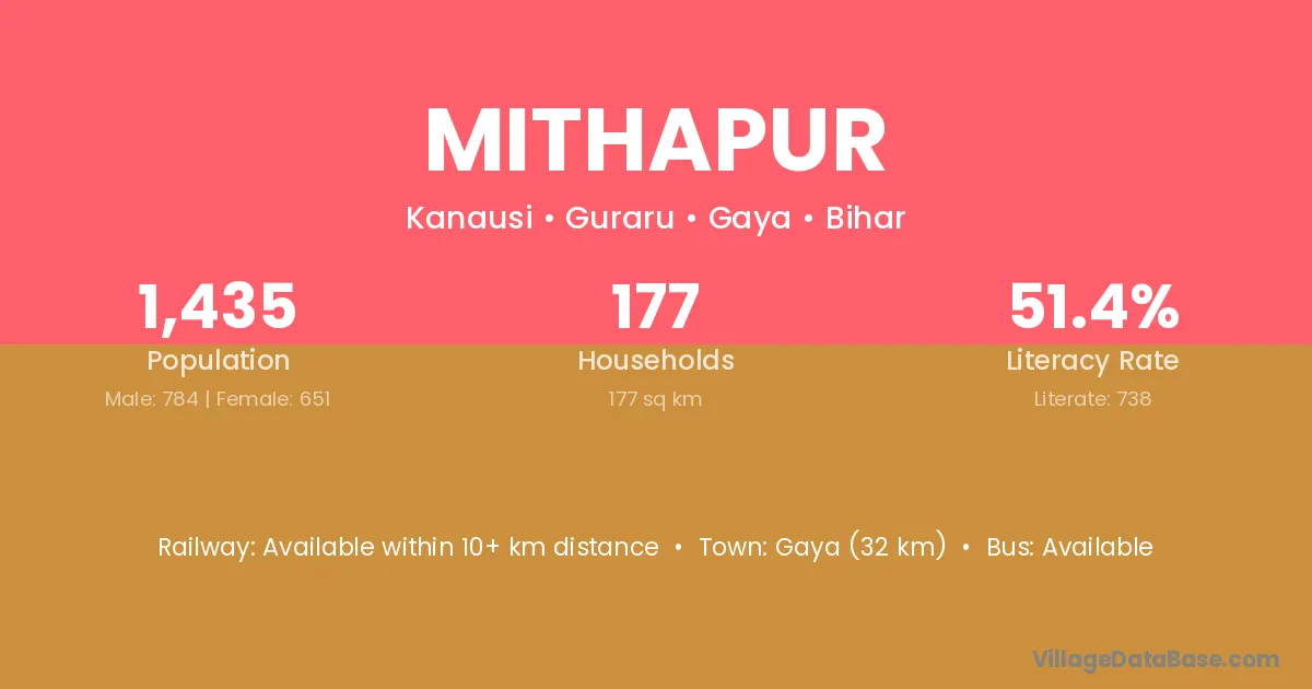 Mithapur village has a total population of 1,087 people, of which 546 are males and 541 are females.