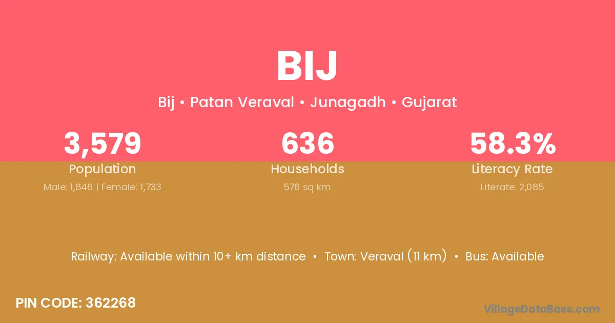 Veraval (11 km) is the nearest town to Bij village for major economic activities and is located approximately 11 km away.