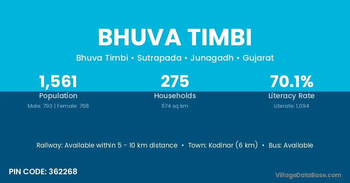 Kodinar (6 km) is the nearest town to Bhuva Timbi village for major economic activities and is located approximately 6 km away.