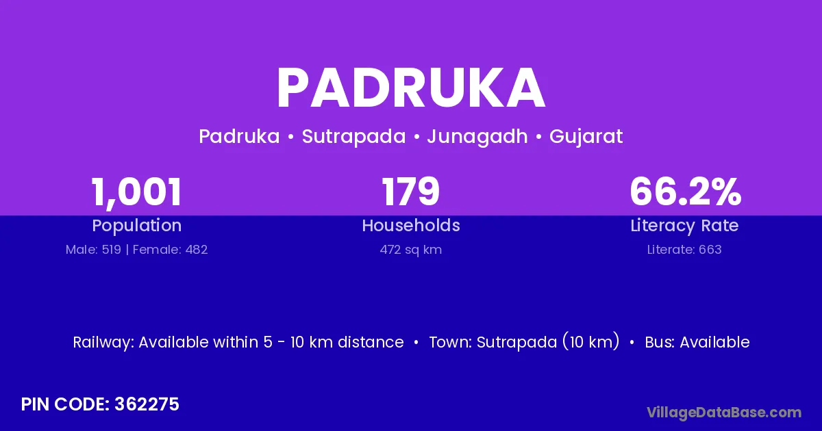Sutrapada (10 km) is the nearest town to Padruka village for major economic activities and is located approximately 10 km away.