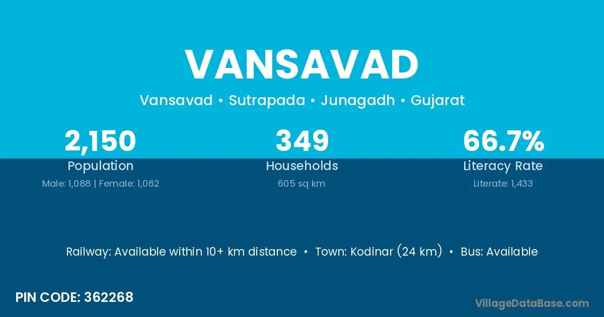 Kodinar (24 km) is the nearest town to Vansavad village for major economic activities and is located approximately 24 km away.