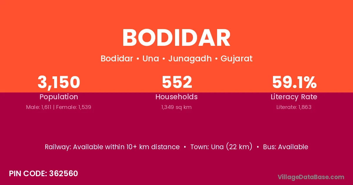 Bodidar village has a total population of 3,150 people, of which 1,611 are males and 1,539 are females.