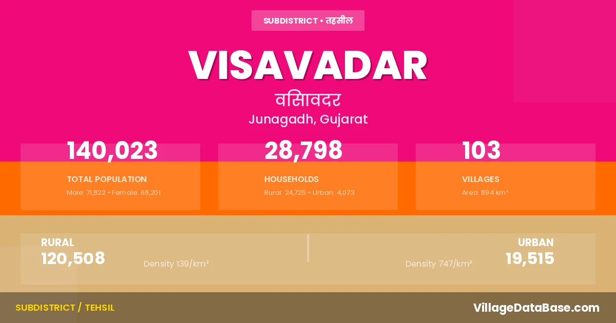 According to the 2011 census The total area of Visavadar Taluka is 894 km², with a population of 140023 people. The population density is 157 inhabitants per square kilometre, and there are approximately 28798 houses in the sub district.