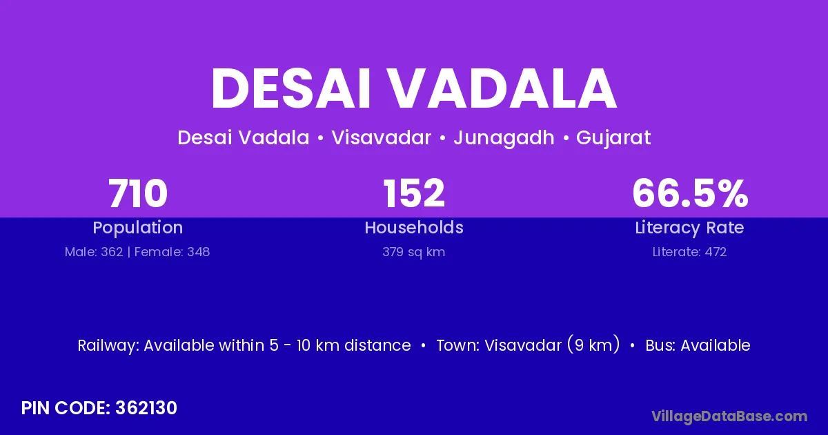 Visavadar (9 km) is the nearest town to Desai Vadala village for major economic activities and is located approximately 9 km away.