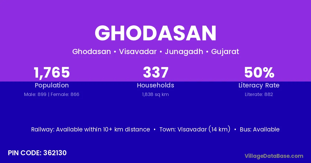 Visavadar (14 km) is the nearest town to Ghodasan village for major economic activities and is located approximately 14 km away.