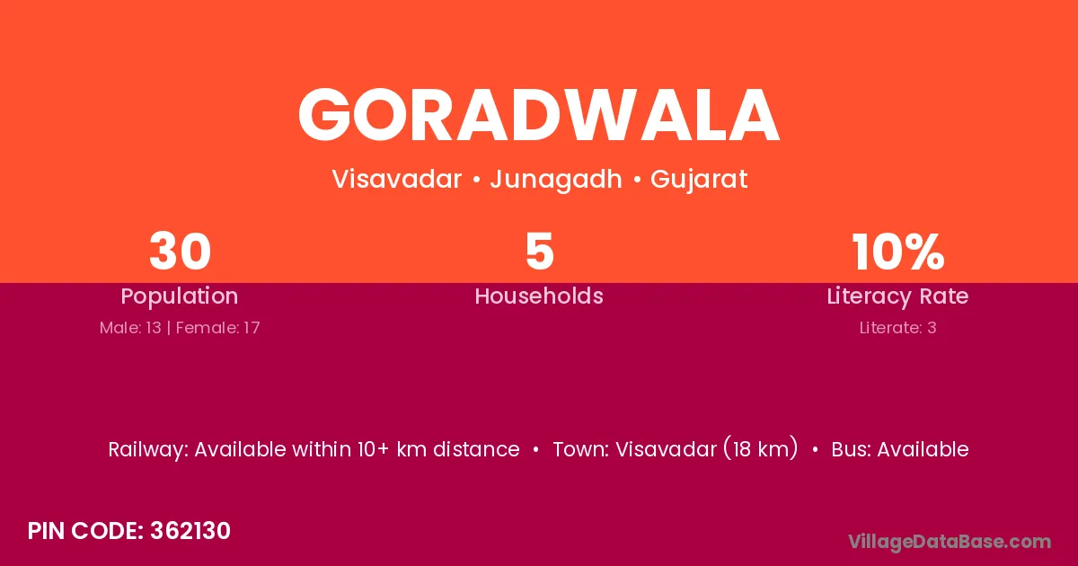 Visavadar (18 km) is the nearest town to Goradwala village for major economic activities and is located approximately 18 km away.