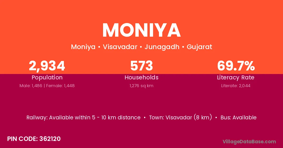 Visavadar (8 km) is the nearest town to Moniya village for major economic activities and is located approximately 8 km away.