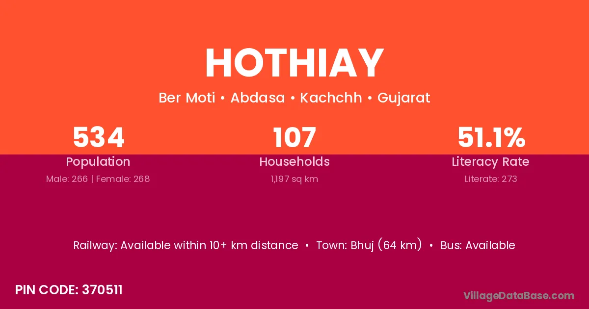 Bhuj (64 km) is the nearest town to Hothiay village for major economic activities and is located approximately 64 km away.