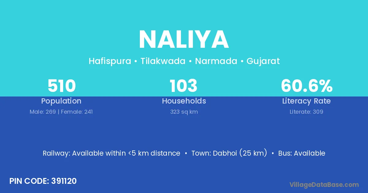 The literacy rate of Naliya village is 60.40%. Male literacy stands at 66.36% and female literacy at 54.03%.