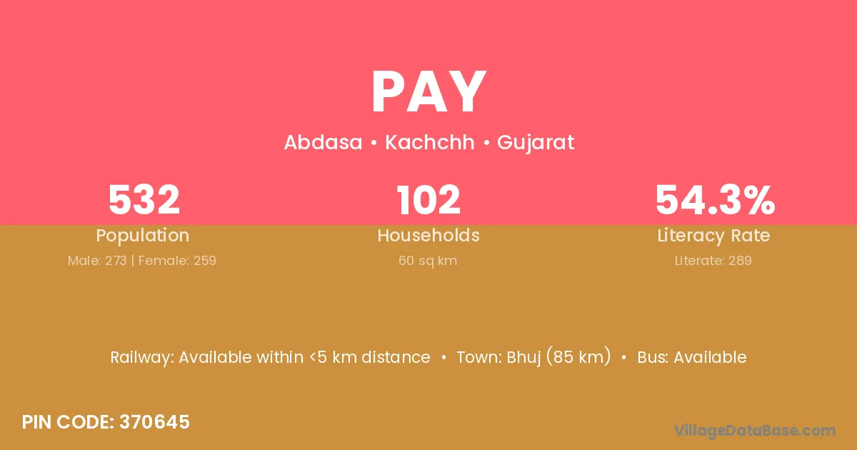 Bhuj (85 km) is the nearest town to Pay village for major economic activities and is located approximately 85 km away.