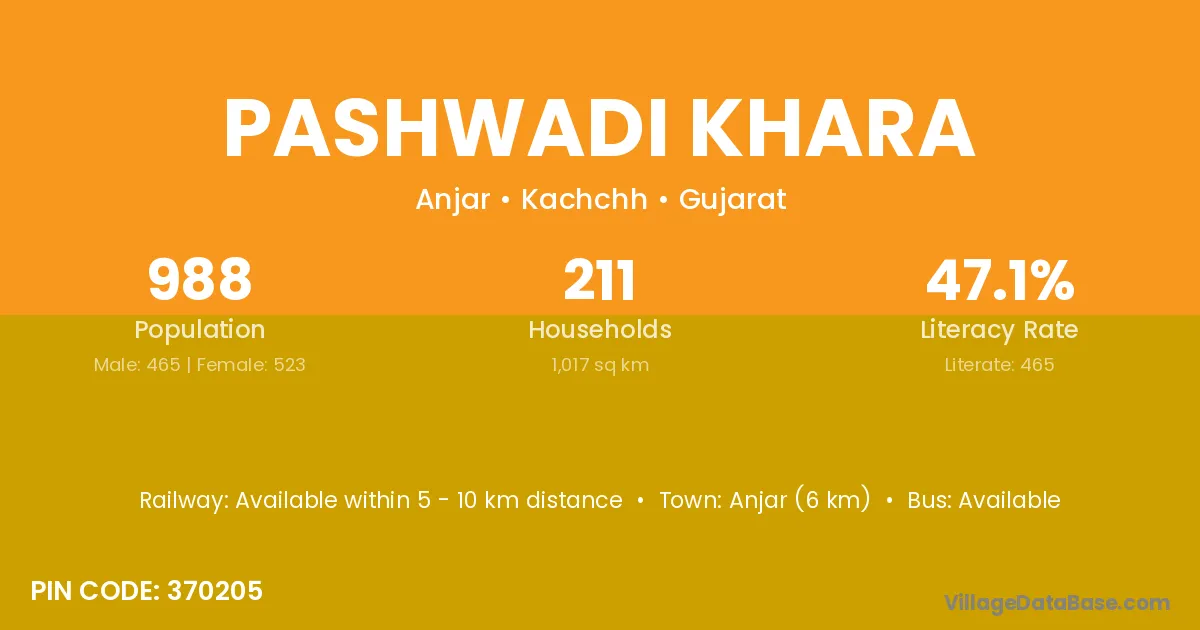 Anjar (6 km) is the nearest town to Pashwadi Khara village for major economic activities and is located approximately 6 km away.