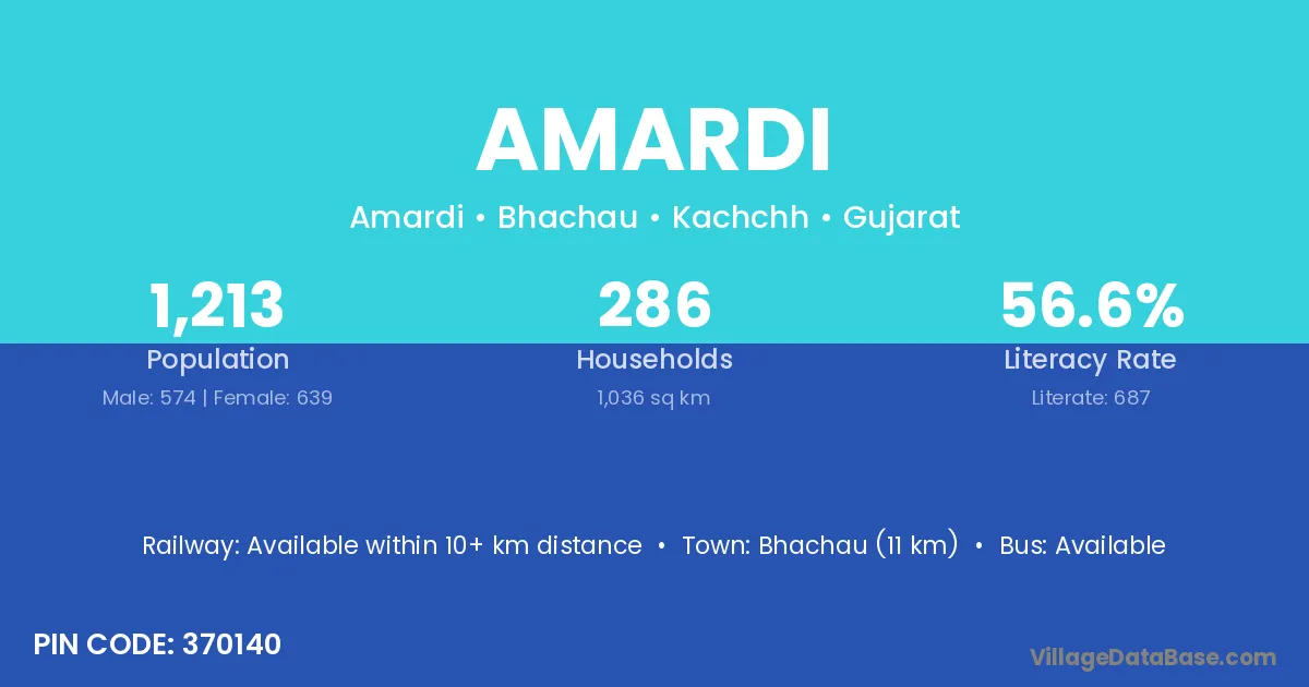 Bhachau (11 km) is the nearest town to Amardi village for major economic activities and is located approximately 11 km away.