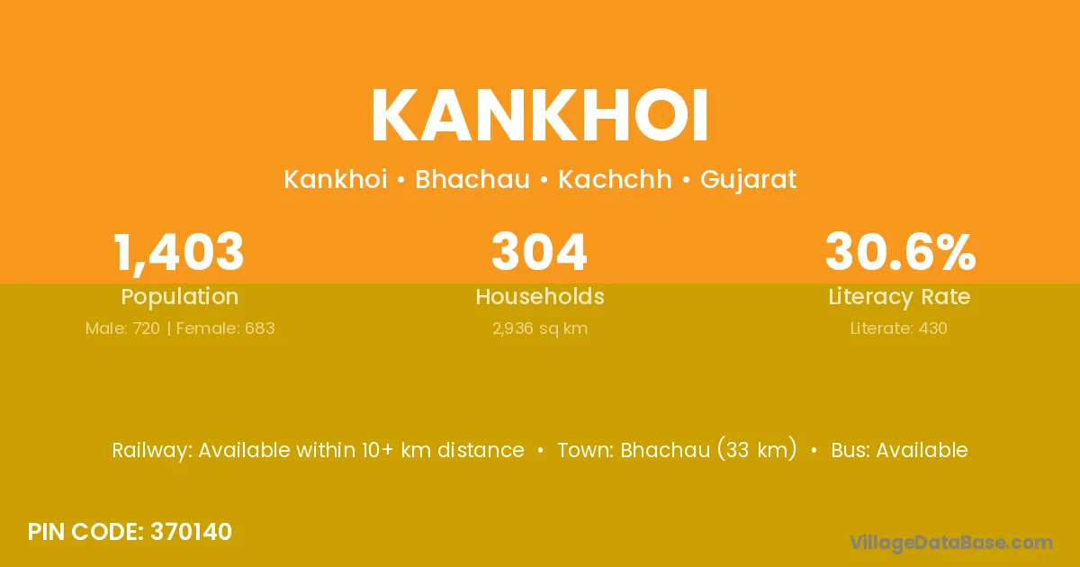 Bhachau (33 km) is the nearest town to Kankhoi village for major economic activities and is located approximately 33 km away.