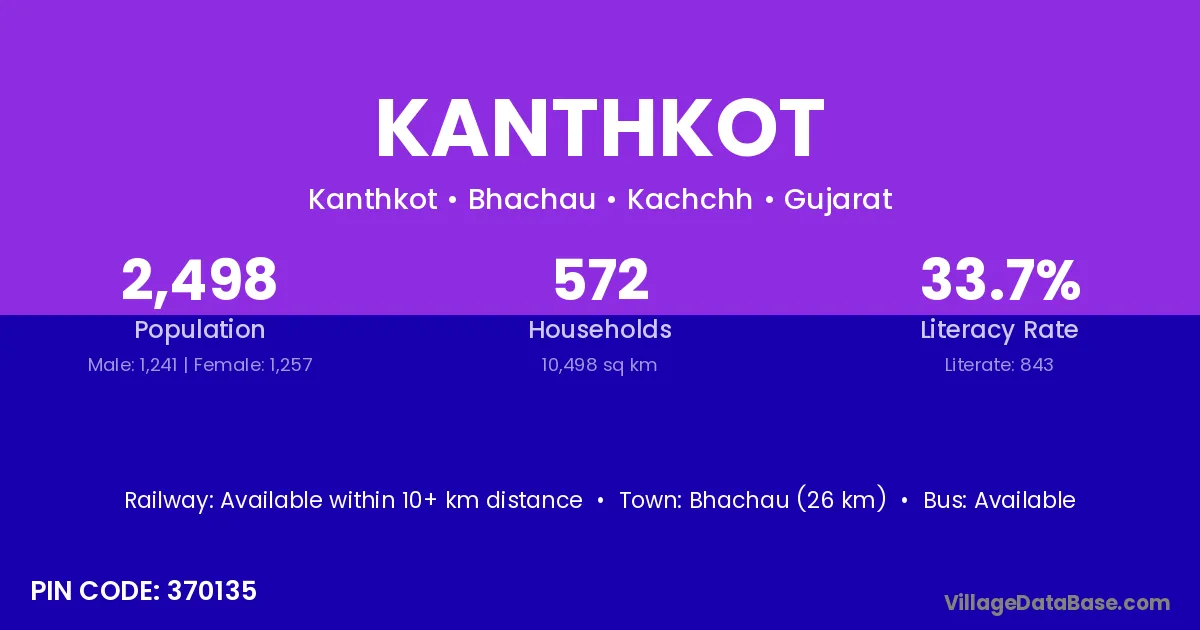 Bhachau (26 km) is the nearest town to Kanthkot village for major economic activities and is located approximately 26 km away.